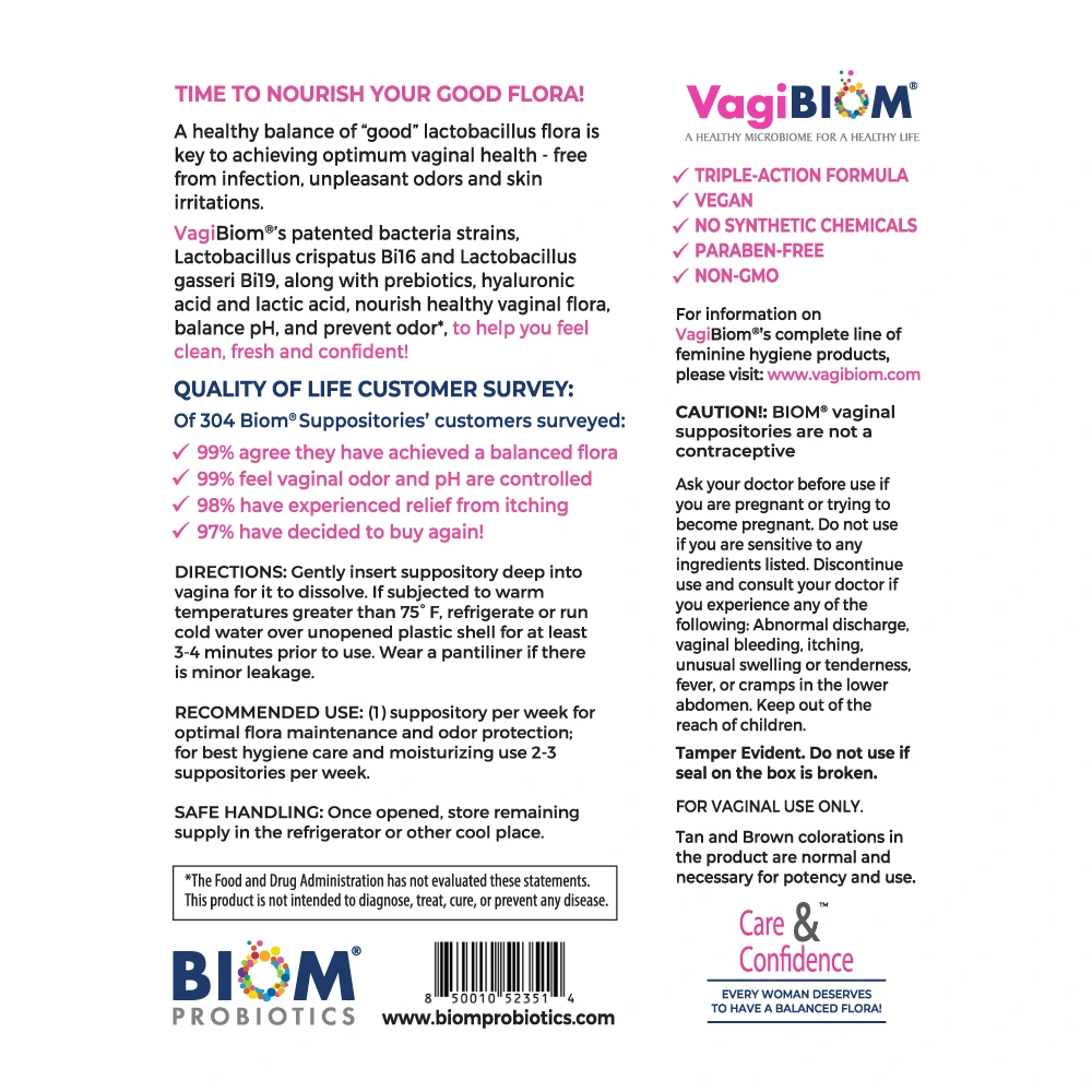 | What is vaginal microbiome? Just like the gut, the vaginal tissue consists of trillions of microorganisms — mostly bacteria, plus some fungi and viruses. Together, these populations make up the vaginal microbiome. But why should I care about my vaginal microbiome? There’s an immense amount of research that is now showing just how important our vaginal microbiome are and just how personalized our approaches to managing them should be. Imbalanced vaginal microbiome profiles have been shown to be associated with increased rates of bacterial vaginosis, infertility, preterm birth and increased risk of STD susceptibility. Why am I only just hearing about the vaginal microbiome? The vaginal microbiome and its impact on women’s health and fertility is only just being unravelled. Research in this space has lagged behind the gut microbiome but very recent work is showing its importance in things like infections, fertility and preterm birth. A healthy vaginal microbiota can help to prevent urogenital conditions such as sexually transmitted infections (STI), yeast infections, urinary tract infections and bacterial vaginosis. Recurrent bacterial vaginosis, does this have to do something with my vaginal microbiome Yes indeed; bacterial vaginosis is a condition in which the vaginal microbiome is imbalanced. An imbalanced vaginal microbiome often contains ‘bad bacteria’ that causes a biofilm to form. Often times, antibiotics alone are not enough to disrupt this biofilm and help you get rid of bacterial vaginosis. Understanding what’s in your vaginal microbiome can help you and your doctor work towards the best solution for you. | Why use Biom’s vaginal suppository to balance vaginal microbiome? Biom’s powerful synergistic combination of vaginal probiotics, prebiotics, and lactic acid restores the balance of microflora, and is helpful for common urogenital problems including bacterial vaginosis and yeast infections. The formulation also has hyaluronic acid that has the capacity to moisturize vaginal for hydration and lubrication. Our patented microbiome BiomsifyTM fermentation technology allows vaginal tissue adapted probiotic flora to maximally adhere and colonize the vaginal tissue. Our proprietary strains of Lactobacillus crispatus Bi16 and Lactobacillus gasseri Bi19 are from healthy human commensal flora that inhibit pathogens with high colonization capacity. Is Biom’s vaginal suppository safe to use? All the ingredients used in Biom Vaginal Suppository are safe compounds mostly originated from organic vegan sources. It includes: Coconut fatty acids, hyaluronic acid, natural moisturizing complex, patented Biomsify Probiotics-Prebiotics Complex 10 billion flora (Lactobacillus acidophilus Bi14, Lactobacillus crispatus B116, Bacillus coagulans Bi34, Lactobacillus gasseri Bi19, enzyme-hydrolyzed cellulose, oligofructose, silica gel), lactic acid. Who makes Biom’s vaginal suppositories? Probiotic Vaginal Suppositories are developed and manufactured by Biom Pharmaceutical Corporation, a research-based biopharmaceutical company focused on the human microbiome. |
